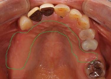 元々の義歯は緑線のように前歯の裏を通るように馬蹄型に設計されており、適合性や嚙み心地は問題なかったそうですが話しづらいのが気になっていたとのことでした。