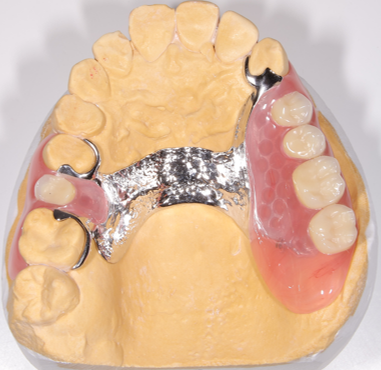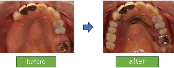 メリット:保険の義歯よりも圧倒的に金属を薄くできるため違和感がとても少なく出来ます。金属が薄いため舌触りも良く義歯特有の話づらさが改善出来ます。また義歯のため取り外し式となりお手入れがとても簡単です。もしこの欠損部にインプラント治療をする場合は100万円以上の費用がかかるためそれに比べると安価にすみます。また外科処置等も必要なく比較的短期間で治療ができます。