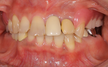 義歯は上顎の真ん中に薄い金属を通すことで話ずらさを改善しました。金属をたくさん使用していますが歯に引っかかる針金は歯茎の形をしているため見た目は義歯を装着しているようには見えません。適合性もばっちりとれています。
